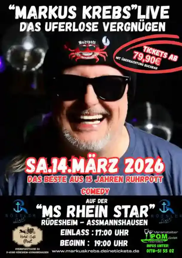 Markus Krebs kommt – und damit genau der Humor, der ohne Umwege trifft. Bodenständig, schlagfertig, gern auch unter der Gürtellinie, aber immer mit Herz. Sein neues Programm „Das uferlose Vergnügen“ liefert genau das, was der Titel verspricht: ein Abend voller Pointen, Kneipenlogik, Ruhrpott-Charme und Geschichten, die jeder kennt, aber keiner so erzählt wie er. Perfekt für alle, die einfach mal wieder lachen wollen, ohne groß nachzudenken – ehrlicher Humor, pur serviert.